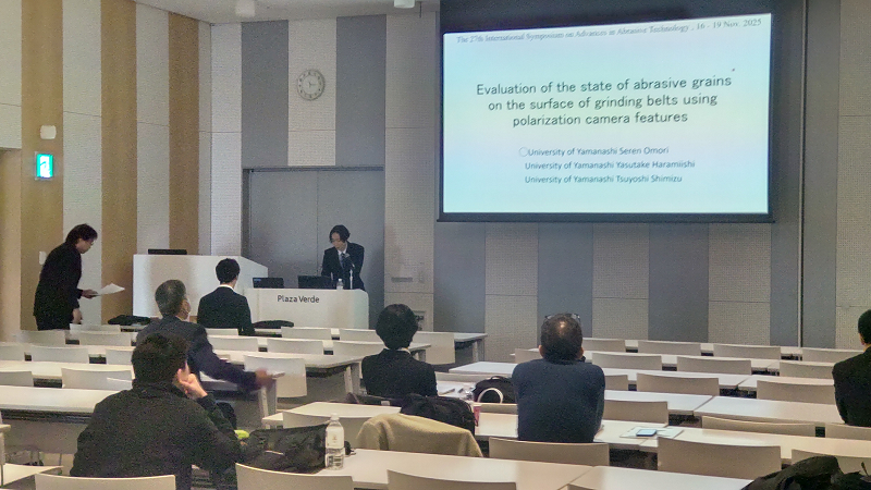 2025年11月16日~19日の日程で第27回国際先端砥粒加工シンポジウム(ISAAT2025:The 27th International Symposium on Advances in Abrasive Technology)が静岡県沼津市のプラザヴェルデ沼津で行われました。18日のIn-proces measurement, monitoring and metrology IIのセッションにて、本研究室の大森君が”Evaluation of the state of abrasive grains on the surface of grinding belts using polarization camera features”と題して発表をしました。